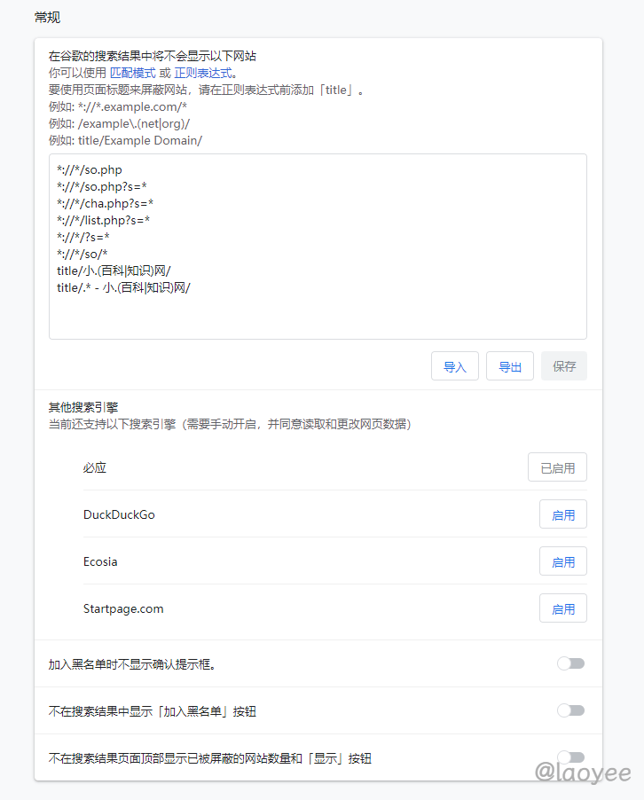如果在看的有程序猿一定不会不知道正则表达式,通过灵活的规则就可以过滤一些我们不想看到的搜索展现内容,老夜搜集的规则大家可以参考下
