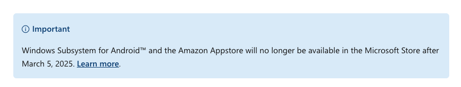 目前在官方一些页面都已经加上了“将于2025年终止对 Windows 安卓子系统的支持”等字样,官方倒是没说明原因,但大概率和用户量太低有关