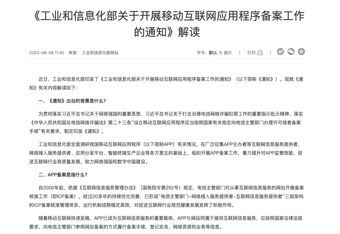 laoyee2023 年 8 月工业和信息化部正式发布的《工业和信息化部关于开展移动互联网应用程序备案工作的通知》,为贯彻落实《中华人民共和国反电信网络诈骗法》、《互联网信息服务管理办法》及《非经营性互联网信息服务备案管理办法》等法律法规要求,存量移动互联网应用程序(含 App、小程序、快应用等,以下简称 App),需履行备案手续。并预留时间作为 App 备案工作的过渡期,而逾期未履行备案程序的 App,将依法依规采取下架、关停、限制更新等处理措施