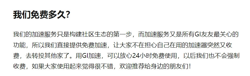 分享了很多免费的,这次继续补充一个,GI加速器还是2024年新上线的,目前官方说是长期免费,这里直接截图了