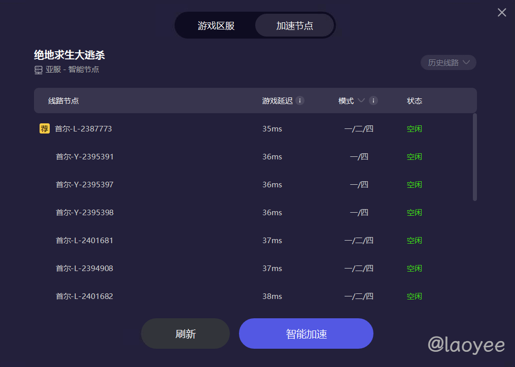 laoyee加速器算是游戏玩家必备的工具了,对于丢包、ping 值稳定有着非常显著的优化效果,浏览网页慢点无所谓,游戏中稍微延迟大一就影响对局结果了