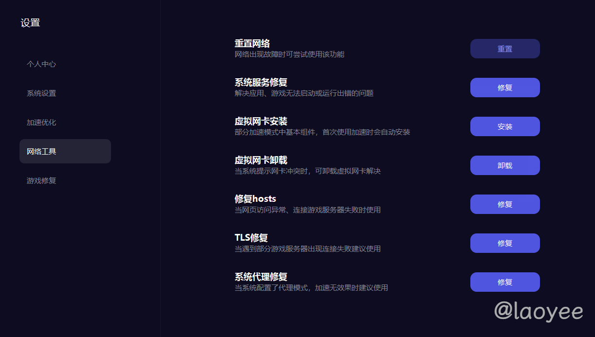 最后就是常规配置,设置中有一些网络相关的检测和修复工具,加速游戏后网络出现问题,直接可以在这里一键修复了