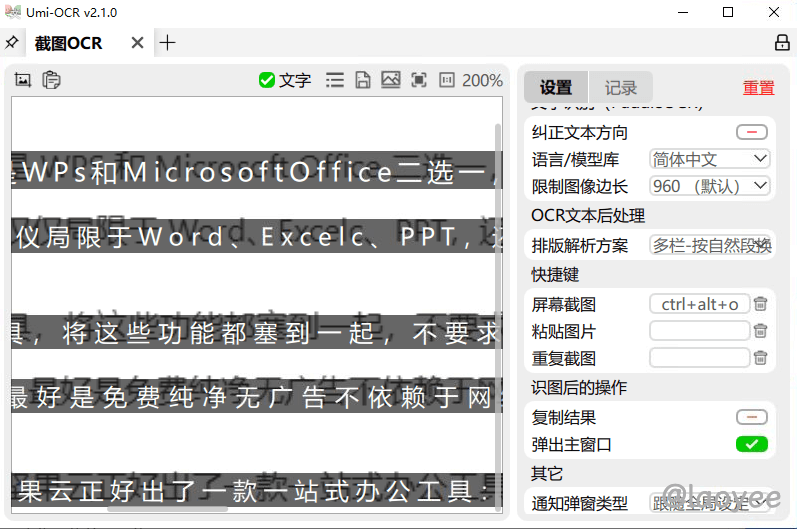文字识别算是 Umi-OCR 最基础的功能了,设置好自定义快捷键后直接上手使用